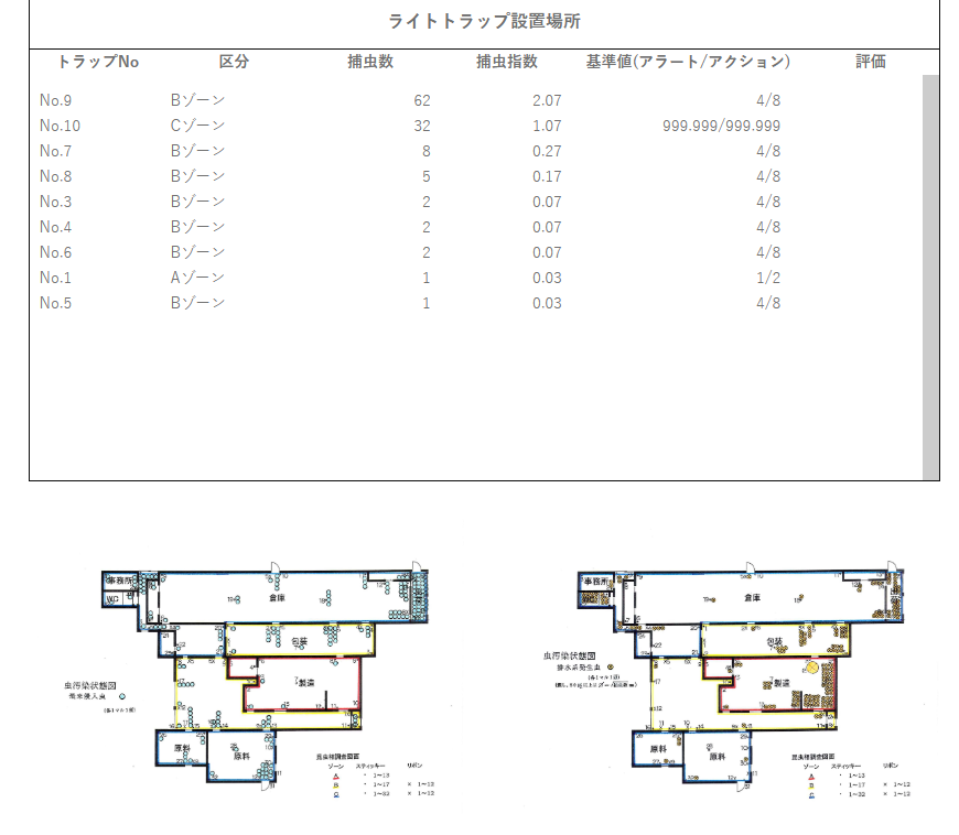 捕虫詳細情報には、トラップナンバー・区分・捕虫数・捕虫指数・基準値・評価が表示されます。