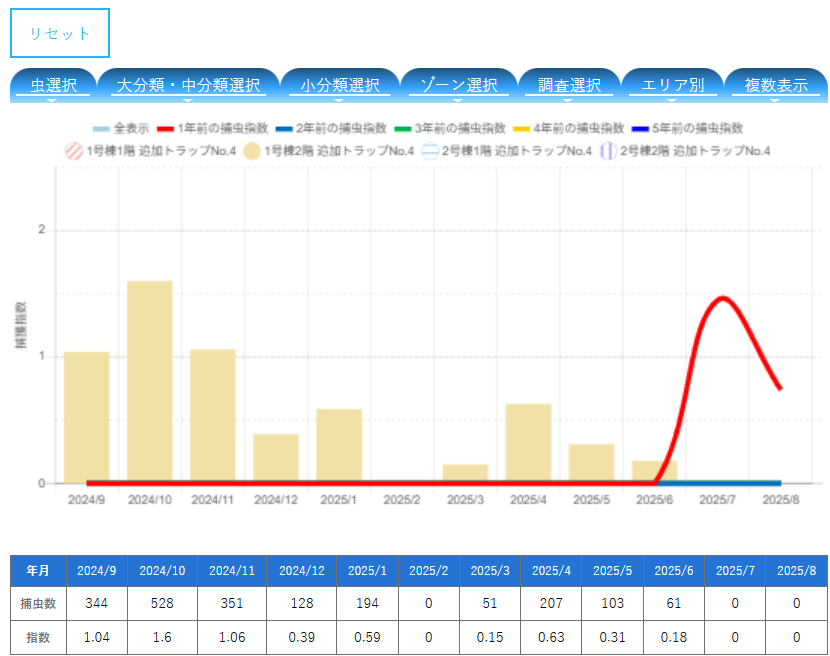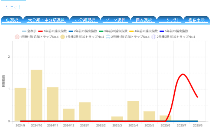 グラフの下に表示される捕虫数は床置きトラップとライトトラップの合算です。