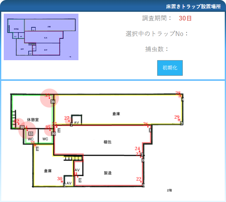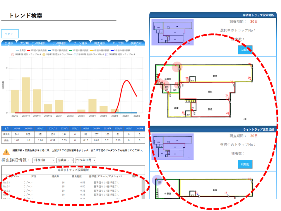 ※表示される図面は最後に登録された図面がすべての期間において適用されます。過去の正確な図面を参照したい場合は報告書(PDF)もしくはトレンド検索画面下部の虫汚染状態図でご確認ください。