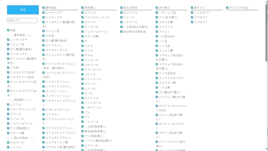 でエリア別か侵入経路別(飛来・屋内・排水・歩行)か選択できます。